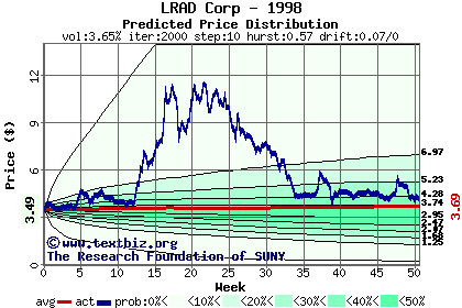 The high to date and low to date prices of the stock plotted against a random walk model for 1998 (what's this?).
