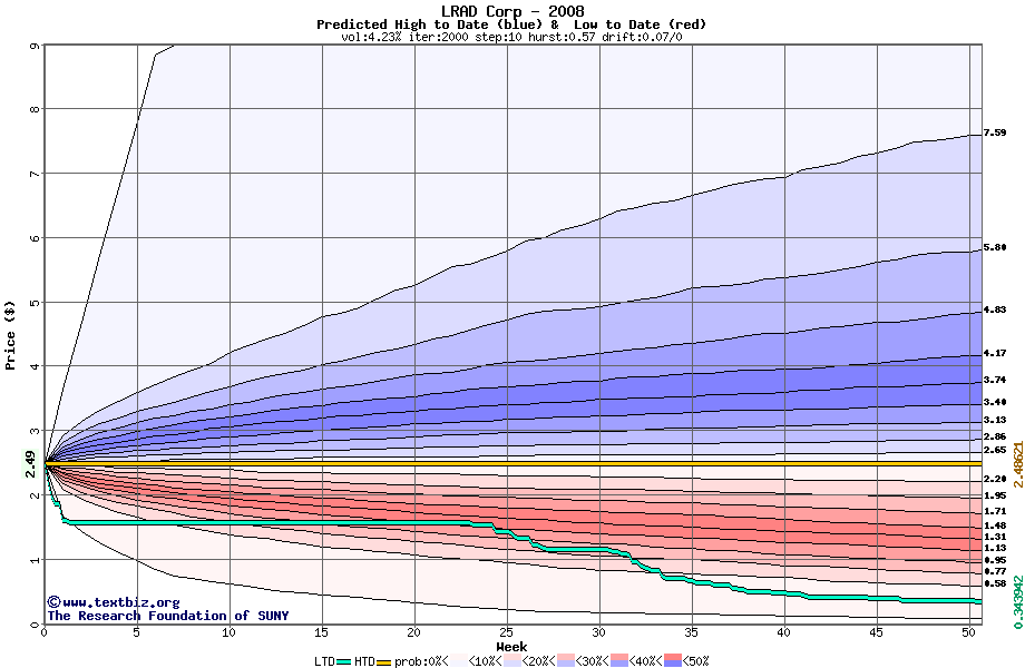 The high to date and low to date prices of the stock plotted against a random walk model for 2008 (what's this?).