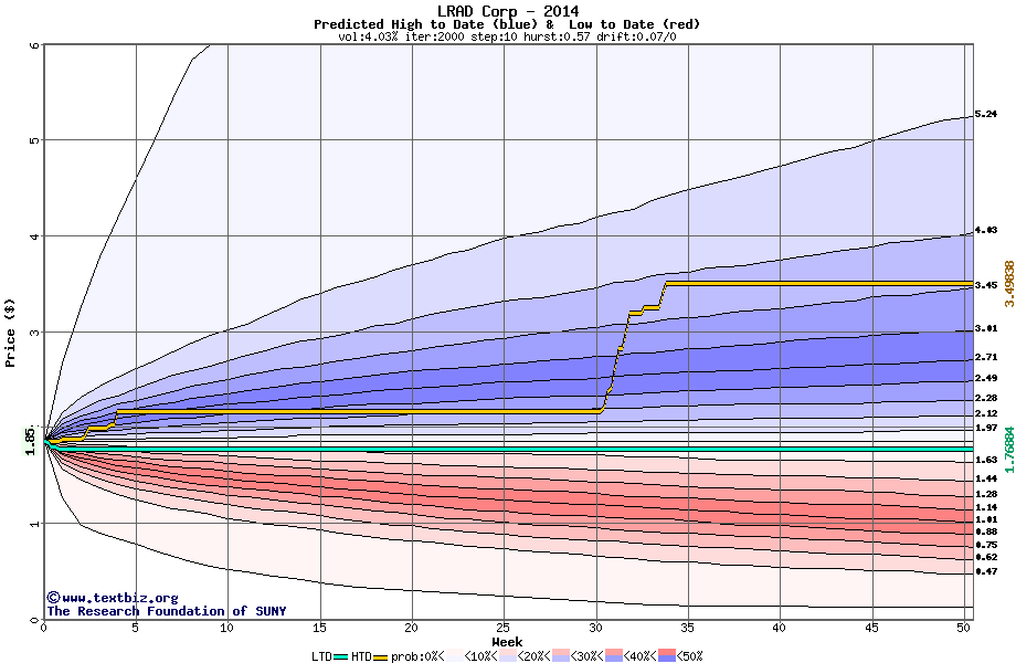 The high to date and low to date prices of the stock plotted against a random walk model for 2014 (what's this?).