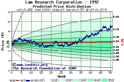 The following graph plots the year-to-date performance of the stock for 1992 compared to the probability calculated by a random walk model.