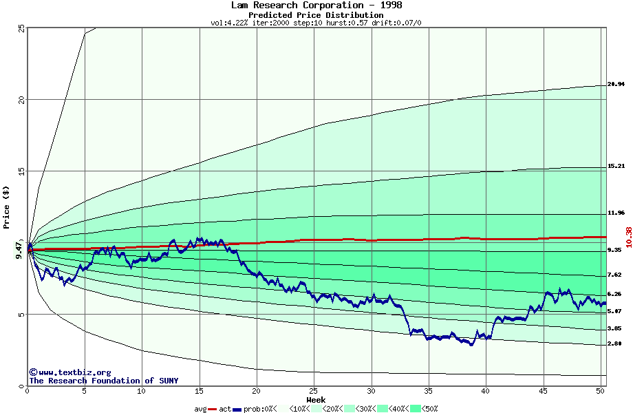 The following graph plots the year-to-date performance of the stock for 1998 compared to the probability calculated by a random walk model.