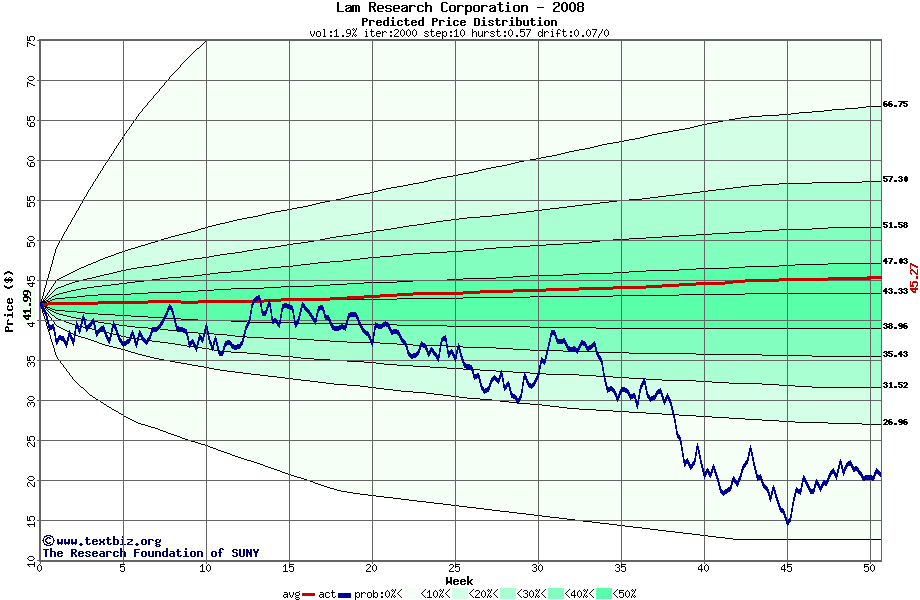 The following graph plots the year-to-date performance of the stock for 2008 compared to the probability calculated by a random walk model.