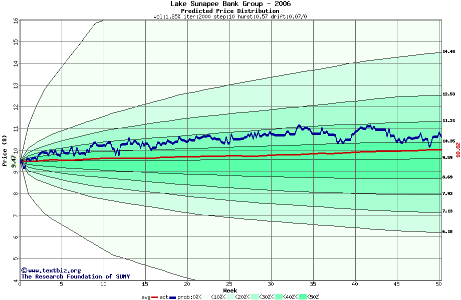The following graph plots the year-to-date performance of the stock for 2006 compared to the probability calculated by a random walk model.