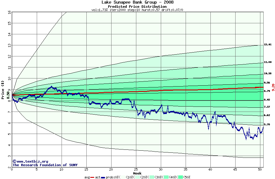 The following graph plots the year-to-date performance of the stock for 2008 compared to the probability calculated by a random walk model.