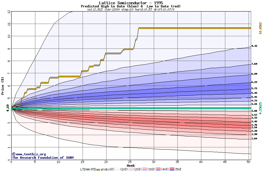 The high to date and low to date prices of the stock plotted against a random walk model for 1995 (what's this?).