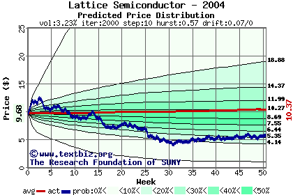 The high to date and low to date prices of the stock plotted against a random walk model for 2004 (what's this?).