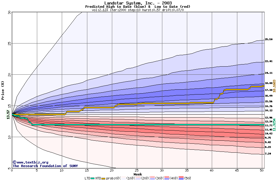 The high to date and low to date prices of the stock plotted against a random walk model for 2003 (what's this?).