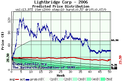 The high to date and low to date prices of the stock plotted against a random walk model for 2006 (what's this?).