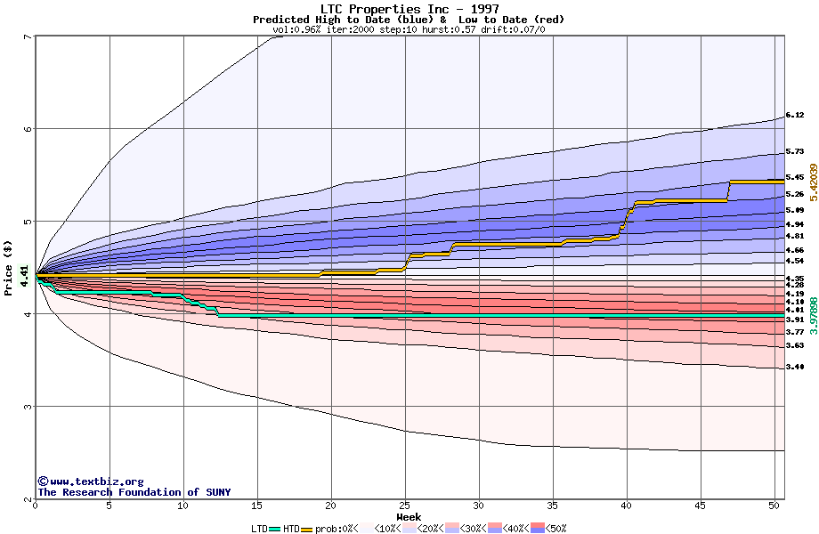 The high to date and low to date prices of the stock plotted against a random walk model for 1997 (what's this?).