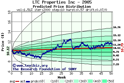 The following graph plots the year-to-date performance of the stock for 2005 compared to the probability calculated by a random walk model.