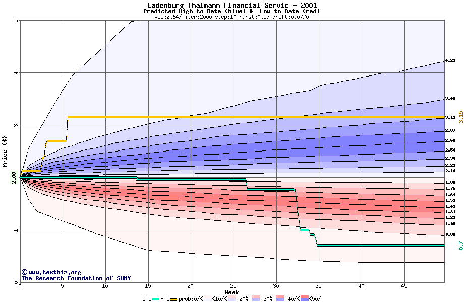 The high to date and low to date prices of the stock plotted against a random walk model for 2001 (what's this?).