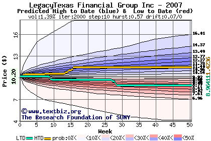 The high to date and low to date prices of the stock plotted against a random walk model for 2007 (what's this?).