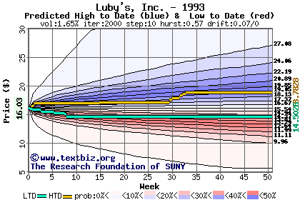The high to date and low to date prices of the stock plotted against a random walk model for 1993 (what's this?).