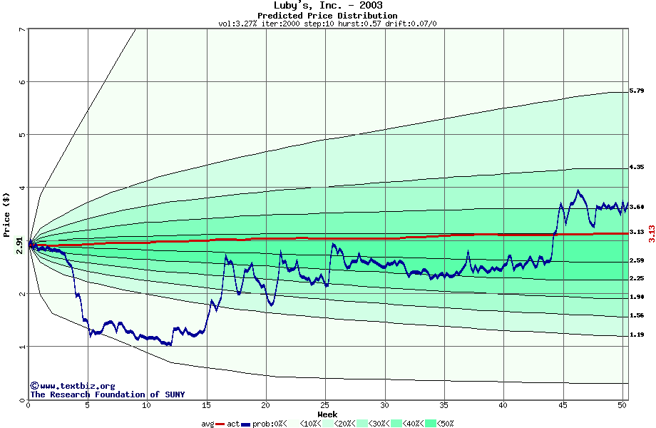 The following graph plots the year-to-date performance of the stock for 2003 compared to the probability calculated by a random walk model.