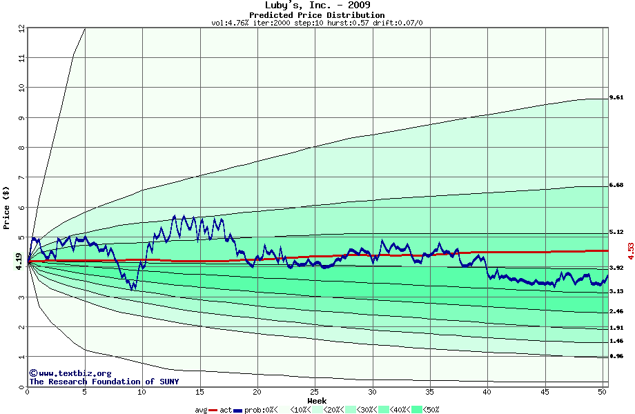 The following graph plots the year-to-date performance of the stock for 2009 compared to the probability calculated by a random walk model.