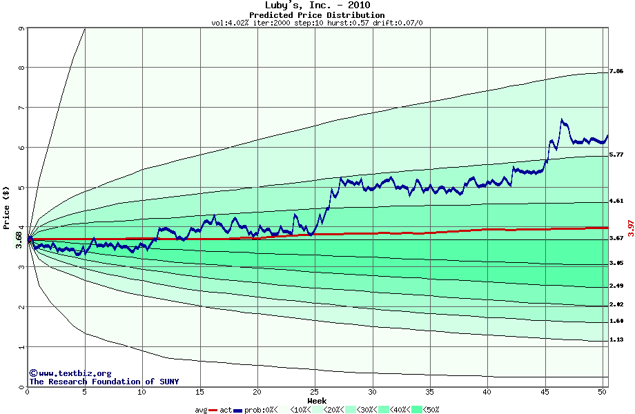 The following graph plots the year-to-date performance of the stock for 2010 compared to the probability calculated by a random walk model.