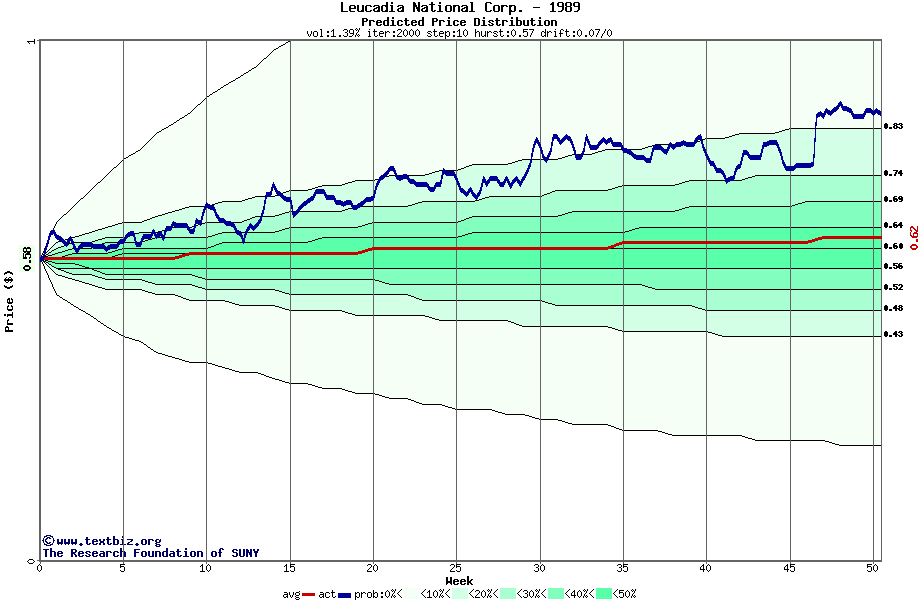 The following graph plots the year-to-date performance of the stock for 1989 compared to the probability calculated by a random walk model.