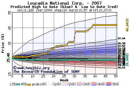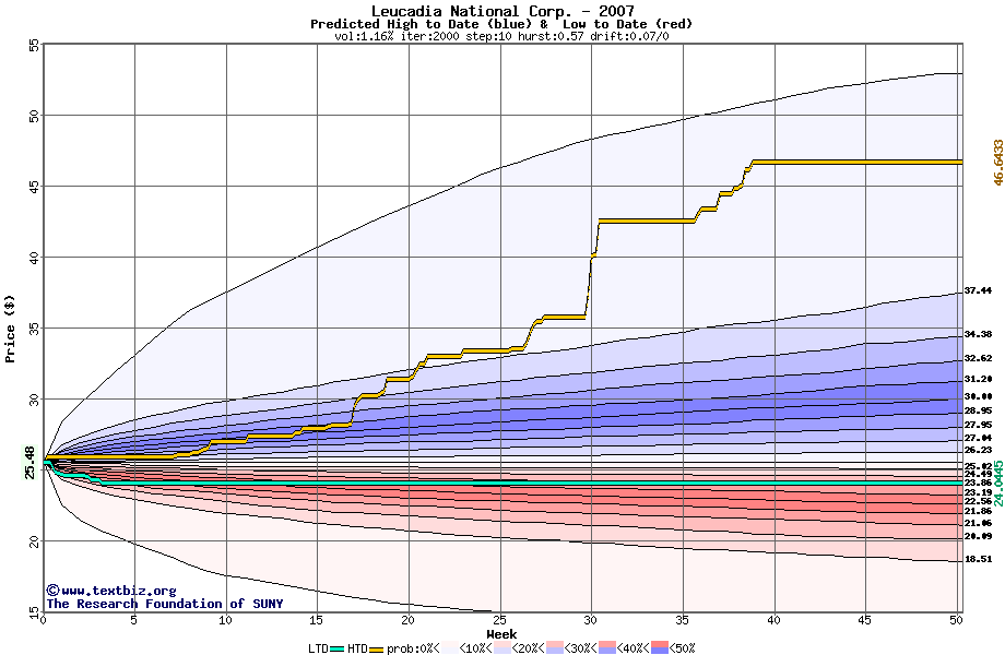 The high to date and low to date prices of the stock plotted against a random walk model for 2007 (what's this?).