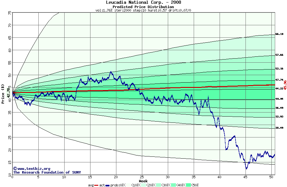 The following graph plots the year-to-date performance of the stock for 2008 compared to the probability calculated by a random walk model.