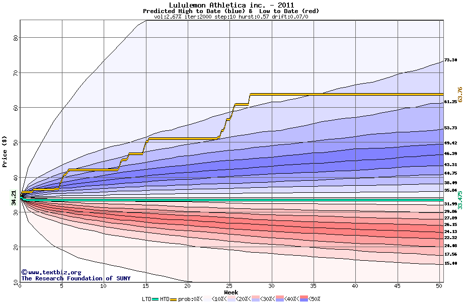 The high to date and low to date prices of the stock plotted against a random walk model for 2011 (what's this?).