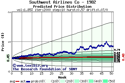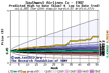 The high to date and low to date prices of the stock plotted against a random walk model for 1982 (what's this?).