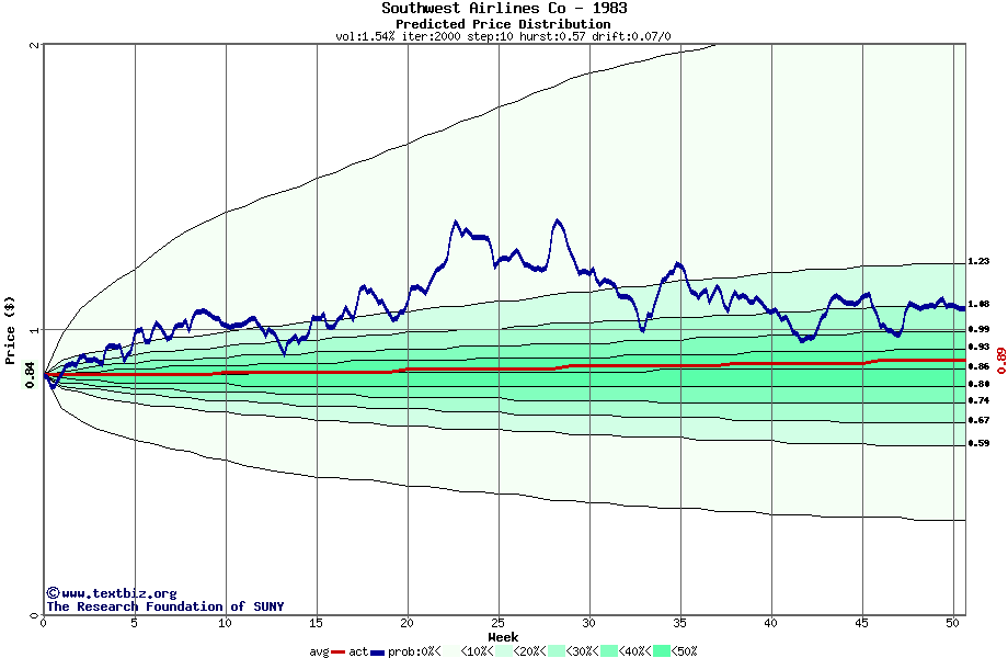 The following graph plots the year-to-date performance of the stock for 1983 compared to the probability calculated by a random walk model.