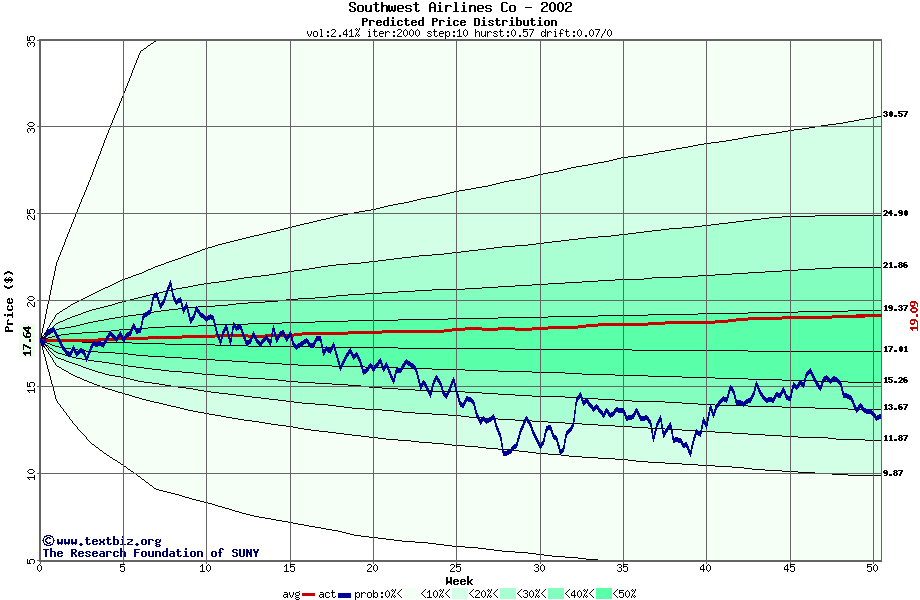 The following graph plots the year-to-date performance of the stock for 2002 compared to the probability calculated by a random walk model.