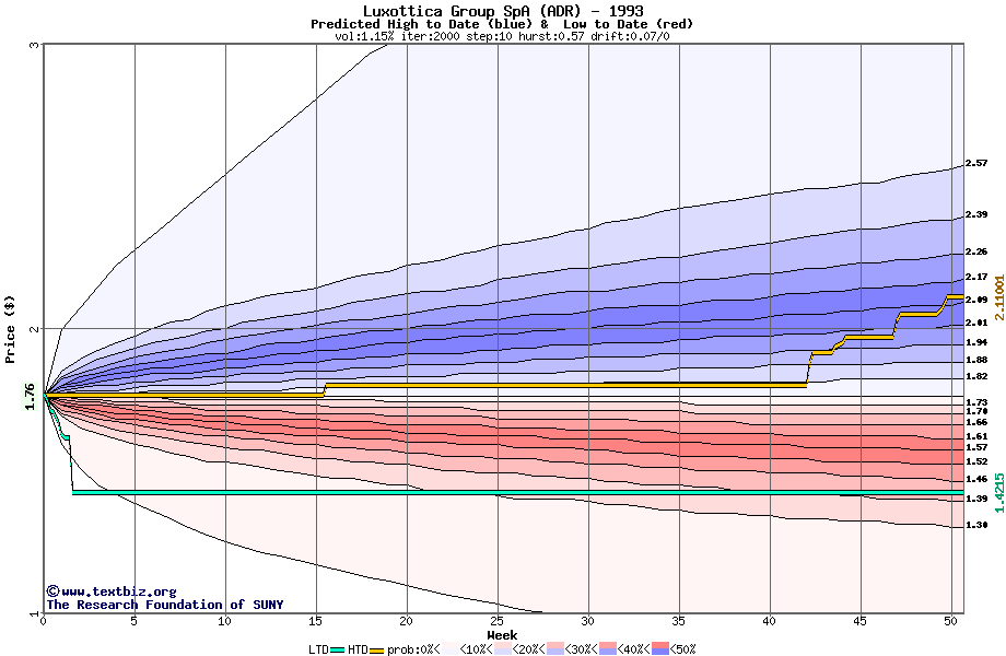 The high to date and low to date prices of the stock plotted against a random walk model for 1993 (what's this?).