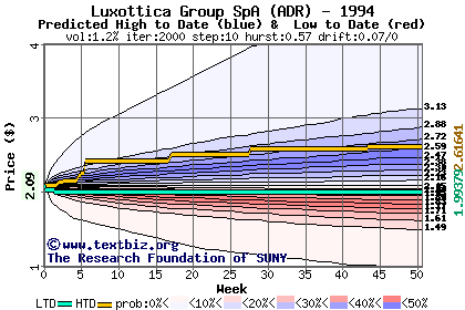 The high to date and low to date prices of the stock plotted against a random walk model for 1994 (what's this?).