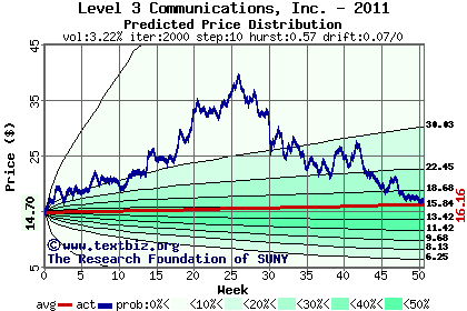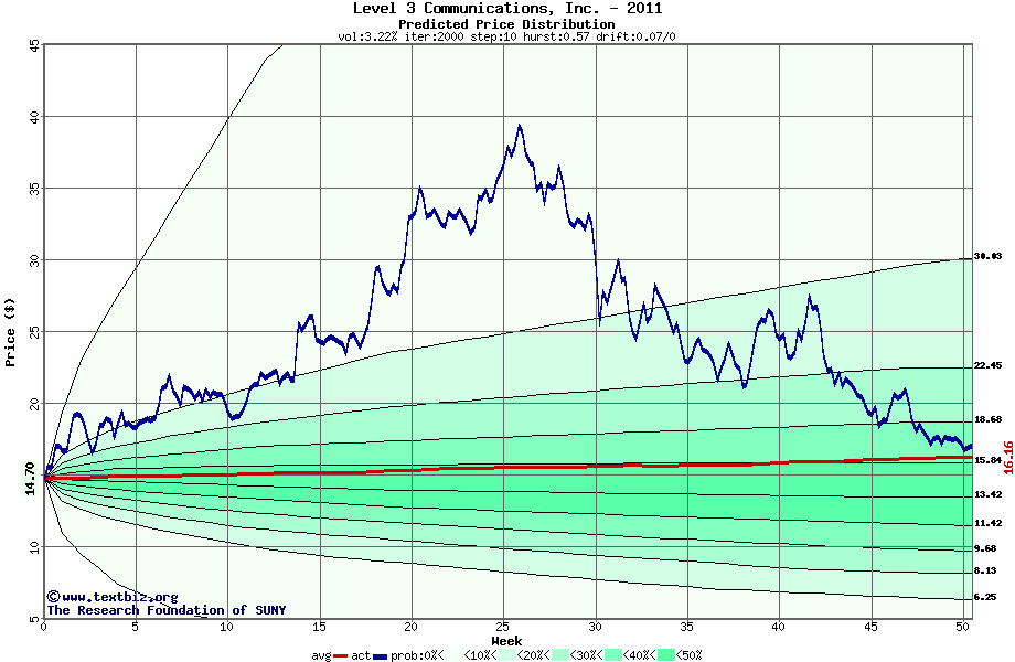 The high to date and low to date prices of the stock plotted against a random walk model for 2011 (what's this?).