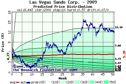 The high to date and low to date prices of the stock plotted against a random walk model for 2009 (what's this?).
