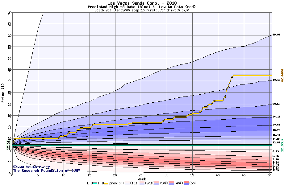 The high to date and low to date prices of the stock plotted against a random walk model for 2010 (what's this?).