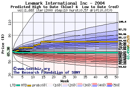 The high to date and low to date prices of the stock plotted against a random walk model for 2004 (what's this?).