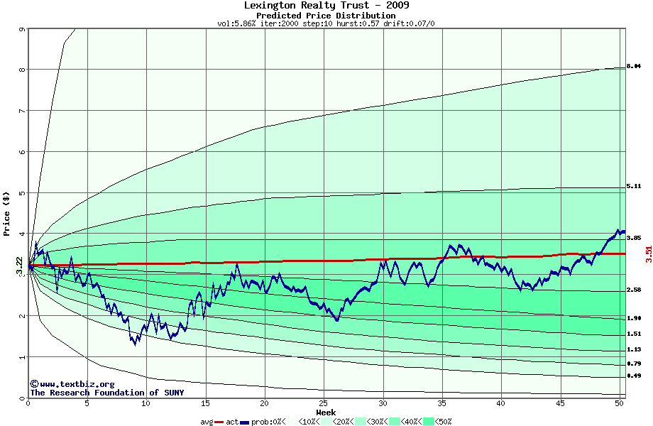 The following graph plots the year-to-date performance of the stock for 2009 compared to the probability calculated by a random walk model.