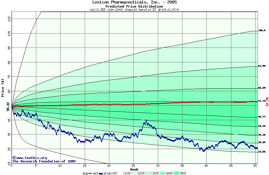 The following graph plots the year-to-date performance of the stock for 2005 compared to the probability calculated by a random walk model.