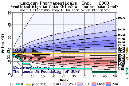 The high to date and low to date prices of the stock plotted against a random walk model for 2008 (what's this?).