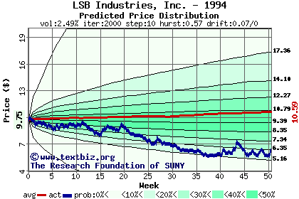 The high to date and low to date prices of the stock plotted against a random walk model for 1994 (what's this?).