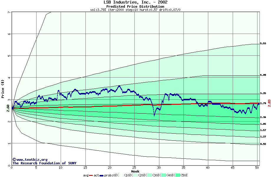 The following graph plots the year-to-date performance of the stock for 2002 compared to the probability calculated by a random walk model.