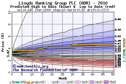 The high to date and low to date prices of the stock plotted against a random walk model for 2010 (what's this?).