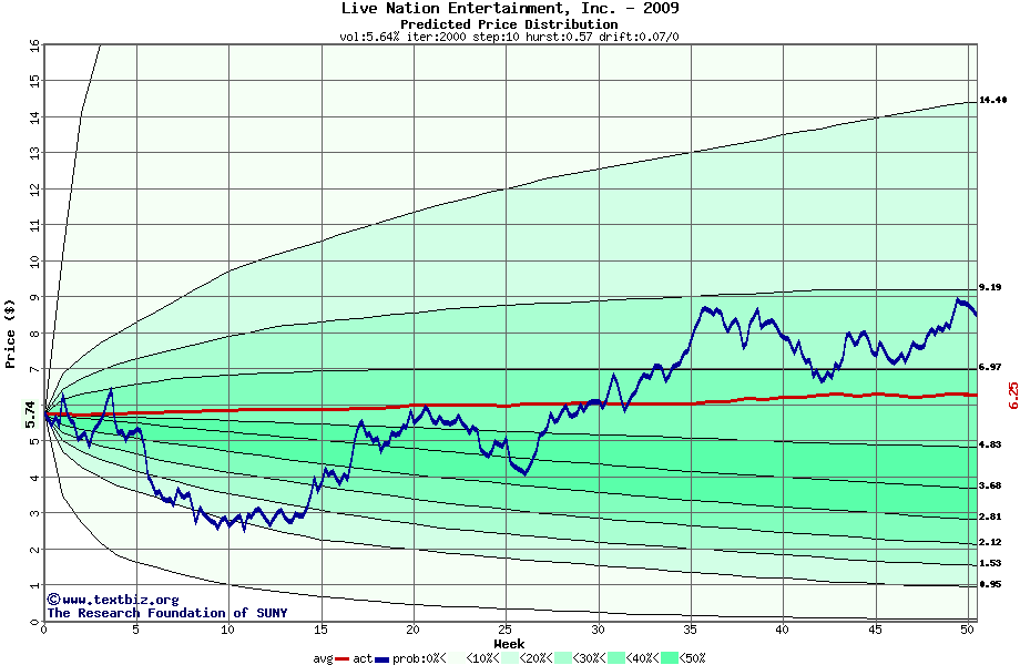 The high to date and low to date prices of the stock plotted against a random walk model for 2009 (what's this?).
