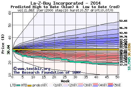 The high to date and low to date prices of the stock plotted against a random walk model for 2014 (what's this?).