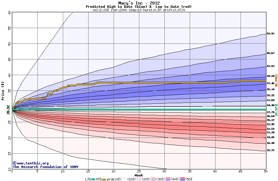 The following graph plots the year-to-date performance of the stock for 2012 compared to the probability calculated by a random walk model.