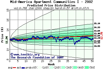 The high to date and low to date prices of the stock plotted against a random walk model for 2002 (what's this?).