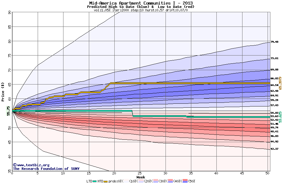 The high to date and low to date prices of the stock plotted against a random walk model for 2013 (what's this?).