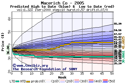 The high to date and low to date prices of the stock plotted against a random walk model for 2005 (what's this?).