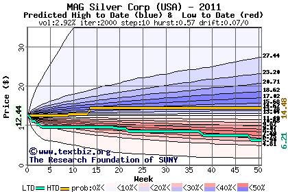 The high to date and low to date prices of the stock plotted against a random walk model for 2011 (what's this?).