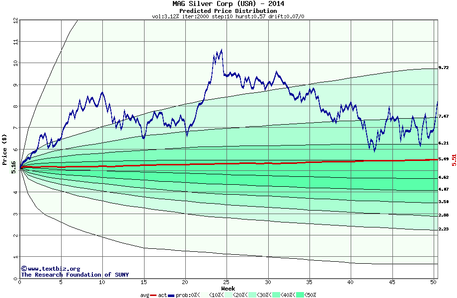 The high to date and low to date prices of the stock plotted against a random walk model for 2014 (what's this?).