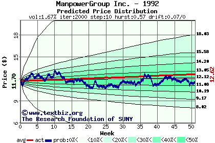 The following graph plots the year-to-date performance of the stock for 1992 compared to the probability calculated by a random walk model.