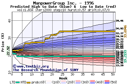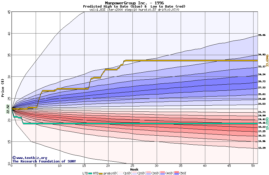 The high to date and low to date prices of the stock plotted against a random walk model for 1996 (what's this?).