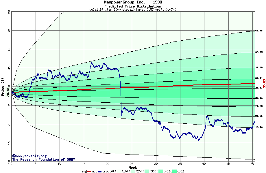 The following graph plots the year-to-date performance of the stock for 1998 compared to the probability calculated by a random walk model.